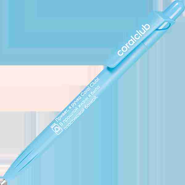 • Шариковая ручка с кнопочным механизмом из материала PET-RECYCLED с надписью "Привет, я ручка Coral Club! В прошлой жизни я была пластиковой банкой".